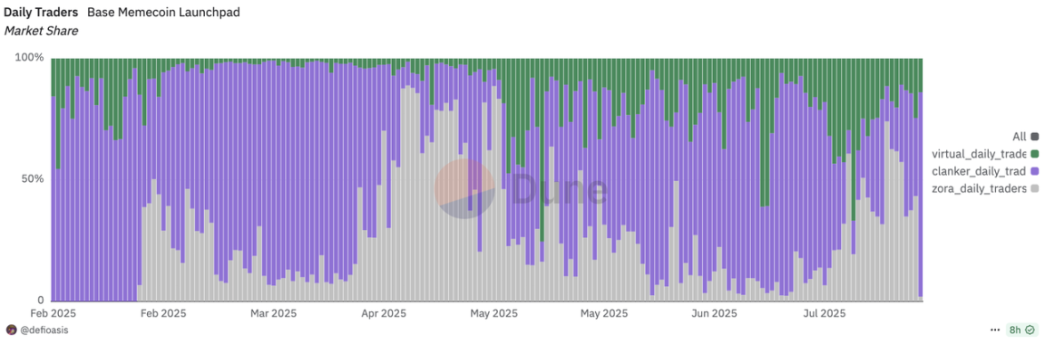 值得一提的是,尽管 Zora Coins 诞生了大量的代币,并占据了 Base 网络近 99% 的代币创建,但绝大部分都缺乏长期交易需求和动力,毕竟贴文代币过于廉价和随时可取代,真正有价值的内容还是太少,加之 Zora Coins 代币每笔交易 3% 的税过于昂贵,Base 上的 Meme 交易量主要还是集中在 Virtuals 和 Clanker。交易用户层面,Zora Coins、Virtuals 和 Clanker 趋向于三足鼎立,各有高光,这也从侧面说明参与 Zora Coins 代币交易的用户数规模不俗,但是金额规模普遍不大。