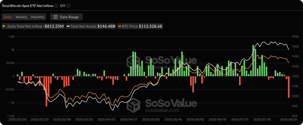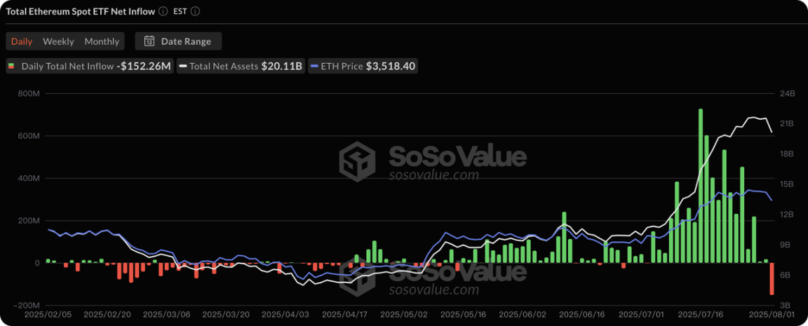 BTC 现货 ETF 单周净流出 6.43 亿,其中 8 月 1 日单日净流出 8.12 亿,创下 3 月以来的最大单周净流出,也创下了近半年第二大的单日净流出。ETH 现货 ETF 则有 1.52 亿的单日净流出,从周级别仍然是小幅净流入的状态。从数据层面,上周 ETH 的表现相对强势。