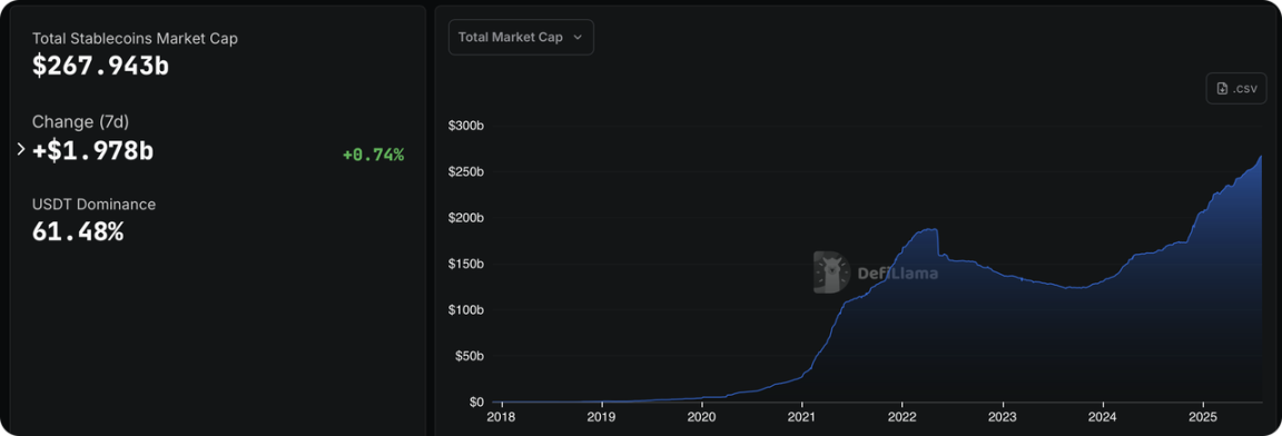 稳定币供应在过去一周依然录得了小幅增长,主要增量来自于 USDe,7 日增幅达到了 17.8 亿 USD。