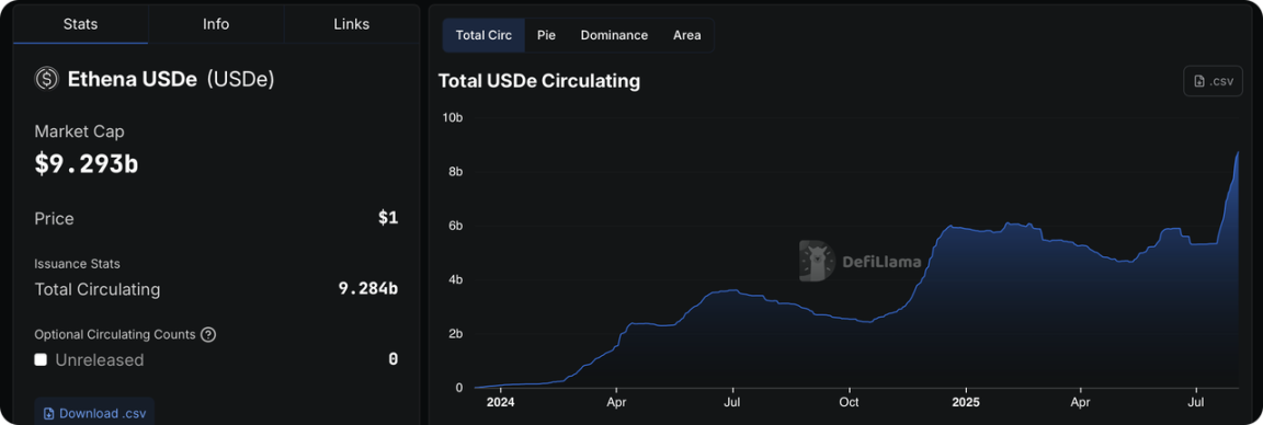 USDe 的发行量从 7 月下旬以来增幅惊人,目前已经达 92.93 亿的总发行量,近期增量主要来自于新产品的落地。上周,Ethena Labs 在 Aave 平台推出 Liquid Leverage 功能,用户可通过存入 50% 的 sUSDe 和 50% 的 USDe 获取推广奖励以及常规借贷利率,在加入杠杆多次循环借贷之后, 5 倍杠杆状态下可获得超高的年化收益率,以及高倍数的 Ethena 积分奖励。虽然杠杆循环贷本身蕴含较大风险,但是依然吸引了相当的实市场资金关注。