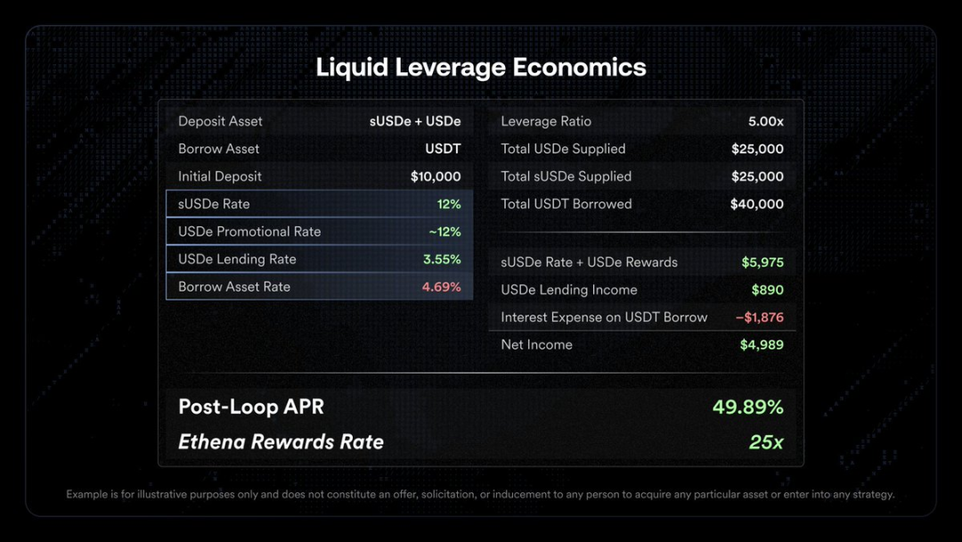 核心机制:「Liquid Leverage」功能,允许用户以 1:1 比例存入 sUSDe(质押 USDe,自带原生收益 12%)和 USDe,不仅能获得多重收益,更关键的是,两者均可作为抵押品循环借出其他稳定币,实现杠杆放大。以 5 倍循环贷为例,理论年化收益率可高达 50%,并附带可观的 Ethena 积分奖励。