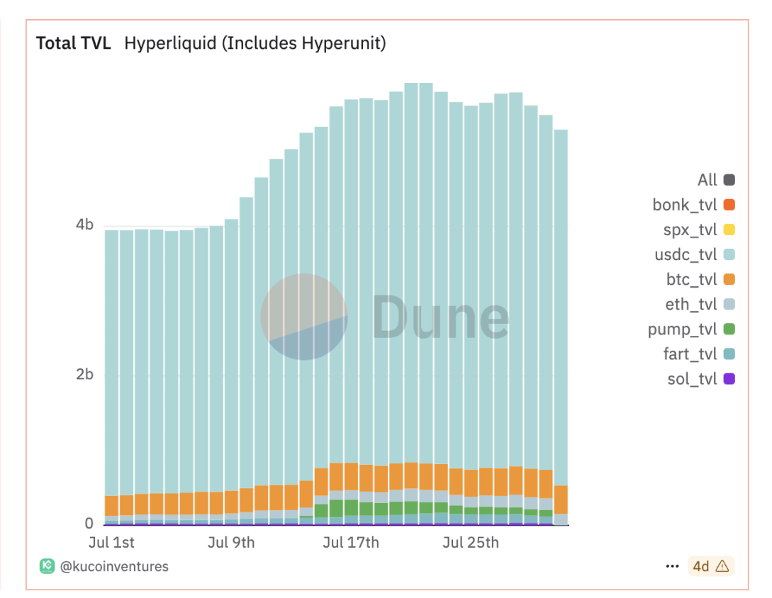 头部永续合约公链 Hyperliquid 的流动性基础设施迎来重要升级。7 月以来,其 TVL 从 40 亿美元增至 55 亿美元,其中 USDC 资产占比高达 86%(约 47.6 亿美元),凸显了其对高质量稳定币的依赖。