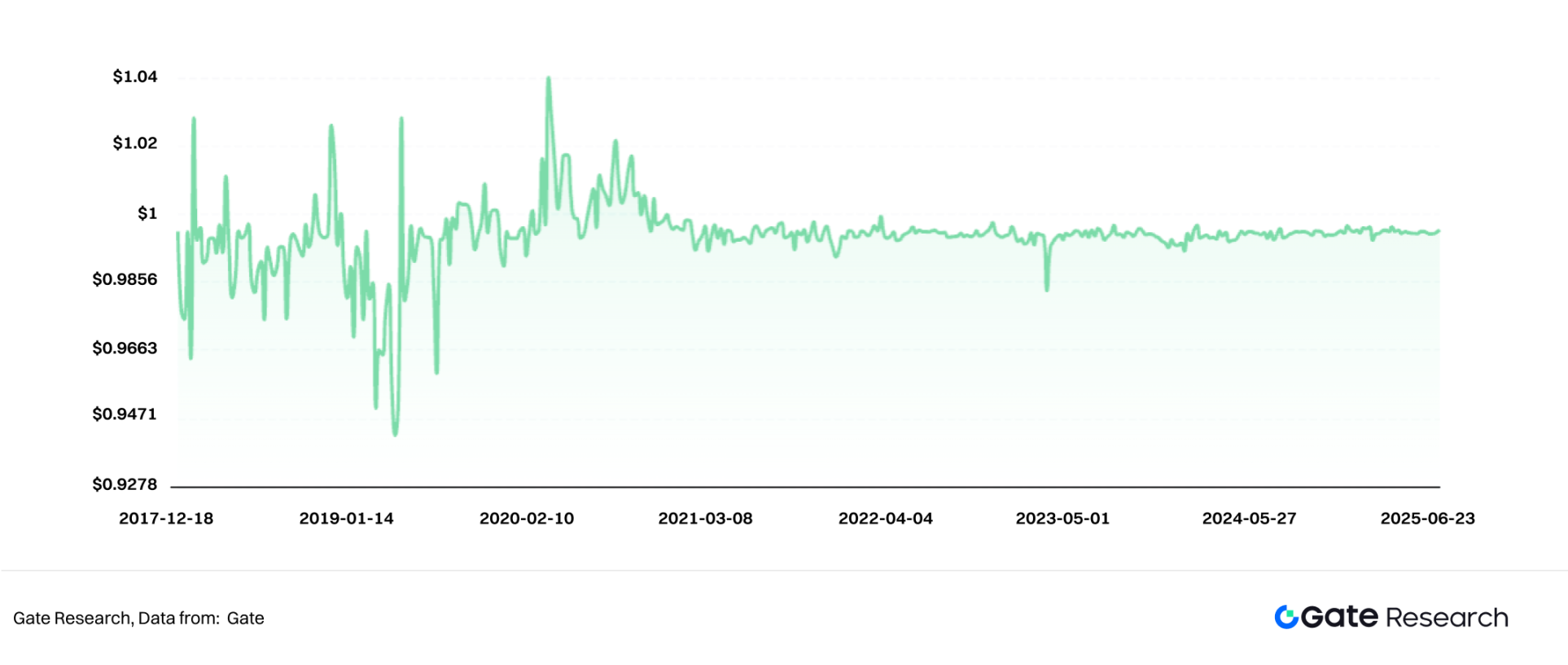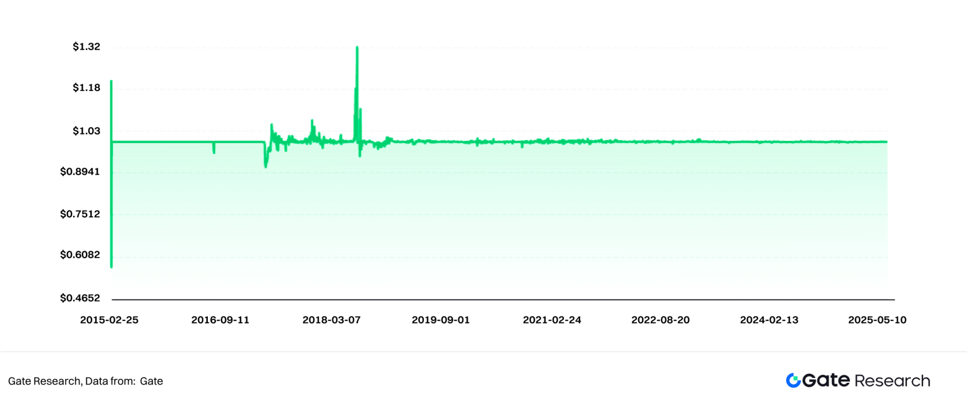 法币质押型稳定币是最常见的稳定币,占据 92.4% 的市场份额。通过锚定美元等法定货币的代币,实现价格的稳定。由发行机构将法币或高流动性资产(如国债)质押入银行或托管账户,再按 1:1 比例铸造代币并发行。例如:USDT、USDC,下图为 USDT 价格曲线。