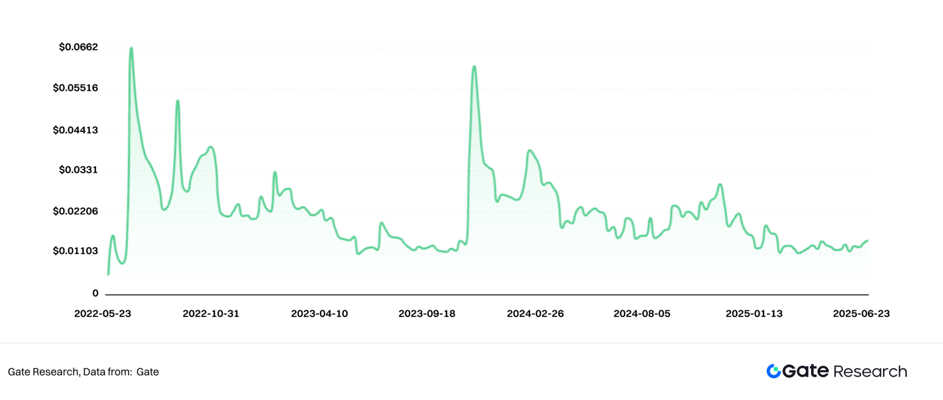 这类稳定币不依赖实物资产支持,而是依靠算法与市场供需来维持代币价格。当代币价格高于 1 美元时,系统会增发代币供应,降低价格;当价格低于 1 美元时,系统会回购并销毁代币,提高价格。例如:UST(已崩盘),在 2025 年,USTC 已经成为一个独立的加密货币,不再与美元挂钩。下图为 USTC 价格曲线。