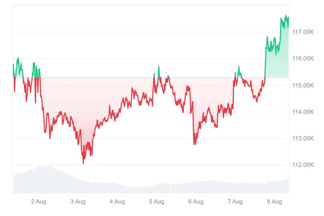 该消息助推比特币价格短线上涨约 2%,一度突破 117,500 美元。