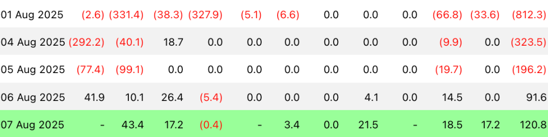 资金数据显示,比特币现货 ETF 在本周前两日遭遇大规模赎回,形成阶段性下行压力,但在 8 月 6 日与 8 月 7 日出现连续两日资金回流,显示抛压有所缓解。具体日度数据如下: