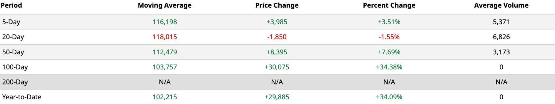 从均线排列看,价格运行在 MA50 与 MA100 之上,表明中长期趋势仍偏多;但 MA5 已低于 MA20,短期可能存在一定调整压力。如果价格能重新站上 MA20 并稳固,将有助于延续上涨趋势。