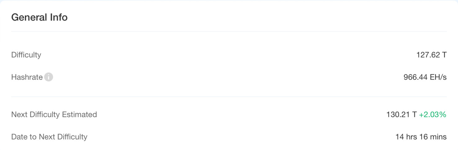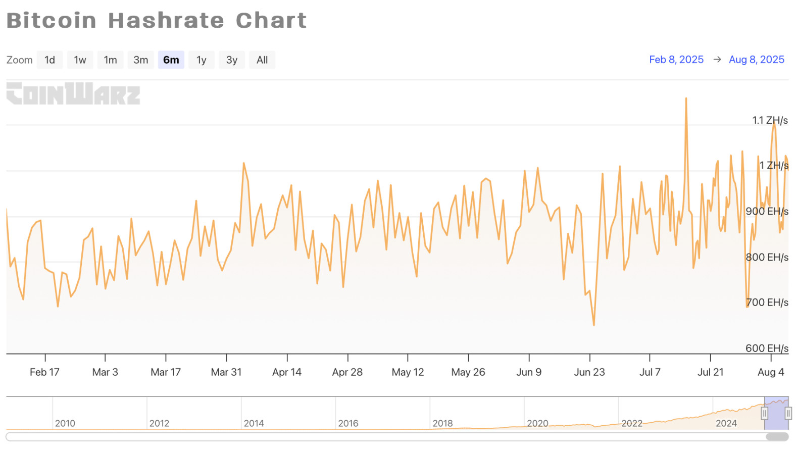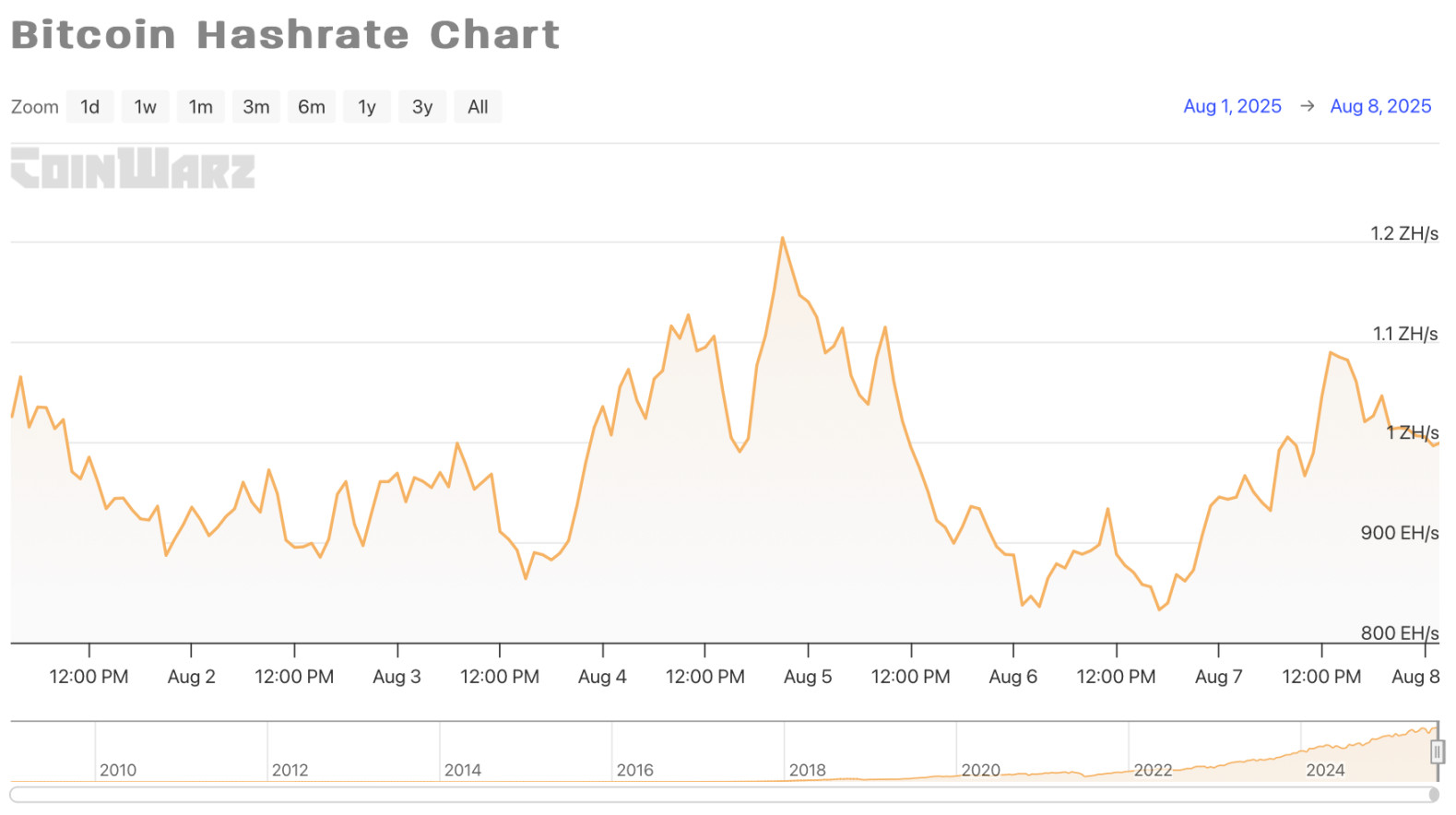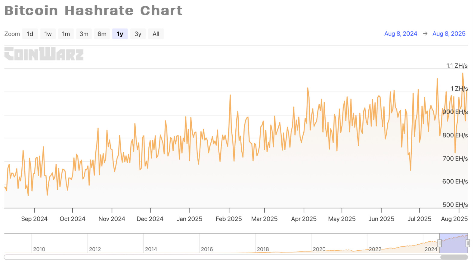 从年度维度观察,哈希率增长尤为明显。2024 年 8 月同期,比特币网络哈希率大致位于 550 EH/s 至 700 EH/s 区间,而目前已稳定维持在 900 EH/s 至 1.1 ZH/s 水平。这反映出比特币挖矿行业的技术升级与矿工扩容力度显著增强,进一步巩固了比特币网络的安全防护能力。哈希率的持续增长通常预示着网络对潜在攻击的抵御能力提升,同时也表明矿工对挖矿经济效益的乐观预期。