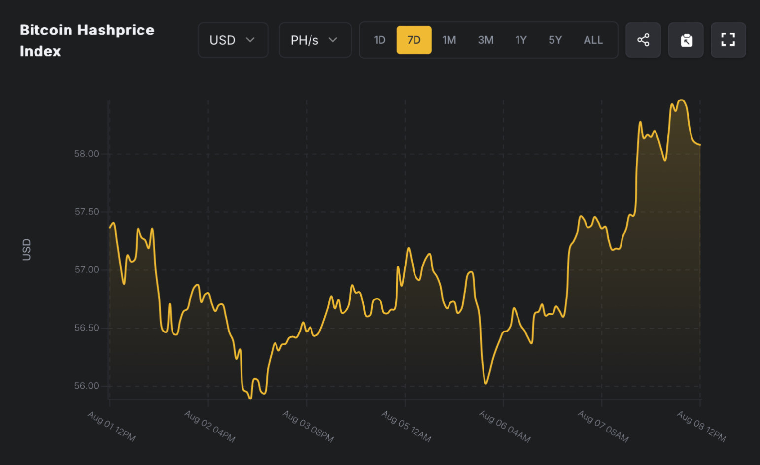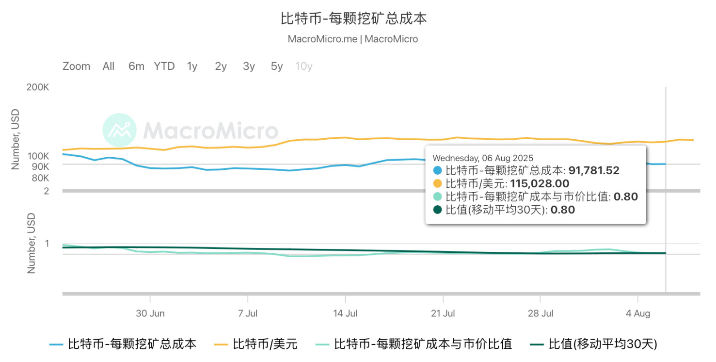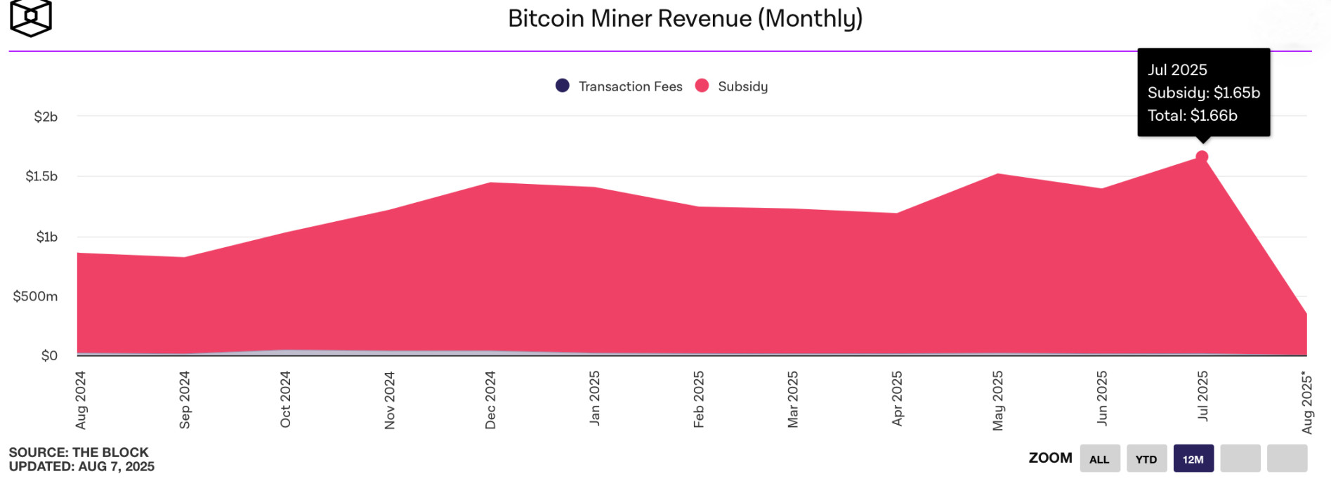 根据 YCharts 数据,过去一周(2025 年 8 月 2 日至 8 月 7 日),比特币矿工的日均总收入(包括区块奖励与交易手续费)在 5,222 万美元至 6,322 万美元之间波动,具体数据如下:
