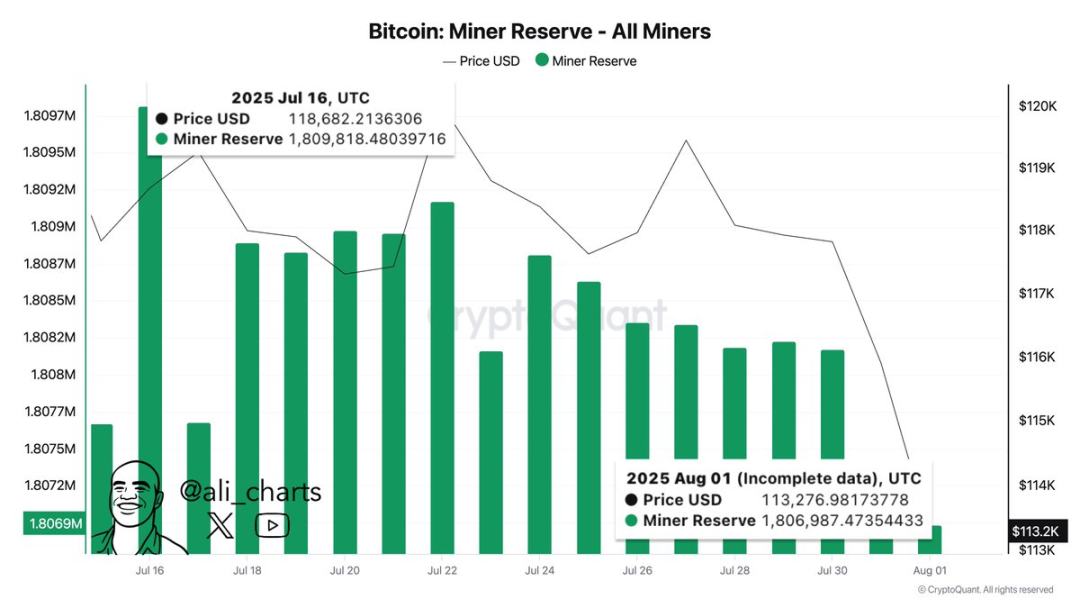 8 月 3 日消息,据@ali_charts 消息,比特币矿工近共两周减持超 3000 枚比特币。截至 8 月 1 日,比特币矿工持币量由 7 月 16 日的 180.98 万枚减持至 180.698 万枚。