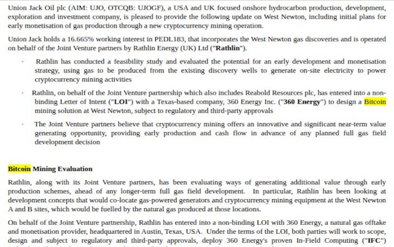 英国油气公司 Union Jack Oil 和 Reabold Resources 拟利用闲置天然气挖取比特币