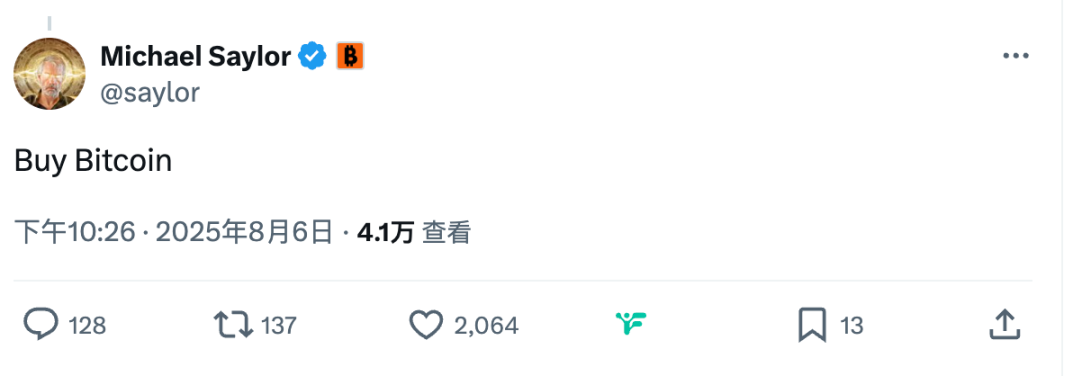 8 月 6 日消息,Strategy 创始人 Michael Saylor 回复社区提问“您收到过最重要的投资建议是什么”时表示,Buy Bitcoin(买入比特币)。