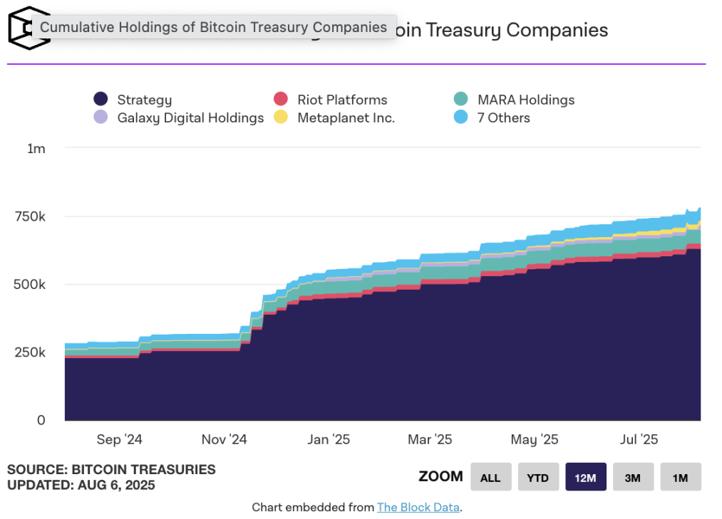 本周确认,MicroStrategy 在 7 月下旬至 8 月初期间共购入 21,021 枚 BTC,总成本约 24.6 亿美元,使其总持仓达 628,791 枚 BTC,位居全球企业榜首。
