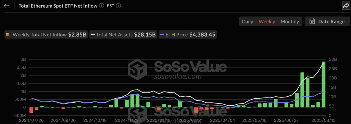 上周,以太坊现货 ETF 延续强劲资金流入趋势,单周流入量达到 28.5 亿美元,创下历史新高水平,远超同期比特币 ETF 的 5,478 万美元流入体量。机构资金的持续追捧为 ETH 在高位中提供了显著支撑。然而在周四宏观数据公布后,ETH 与 BTC ETF 双双由涨转跌,显示出短期内难以摆脱宏观环境制约,后续走势仍需观察美联储政策与经济数据的进一步信号。