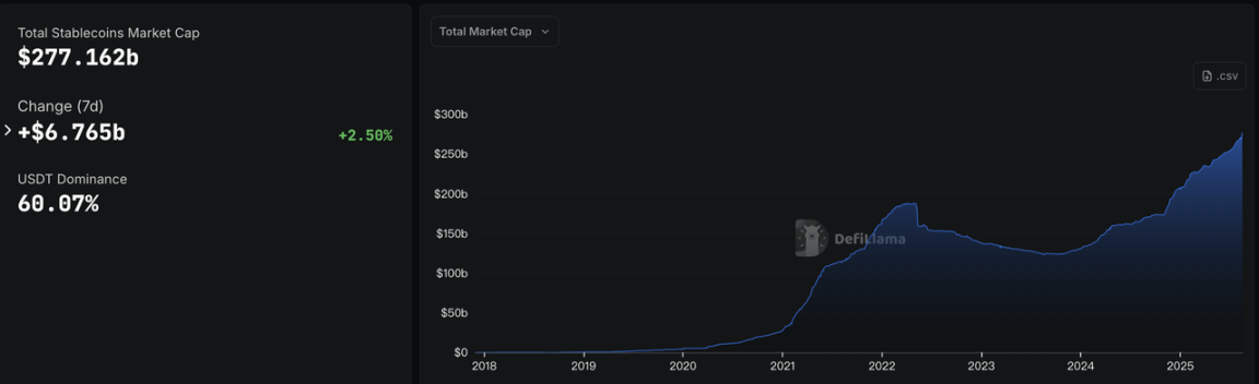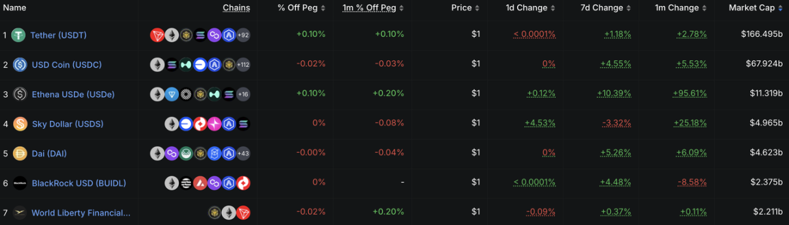 过去一周,稳定币整体供应量增长 67.65 亿美元,周增幅达 2.5%。其中,USDT 增长 22.7 亿美元,USDC 增长 29.5 亿美元,收益型稳定币 USDe 则增加 10 亿美元。传统稳定币与创新型稳定币呈现“双轮驱动”,反映资金依然通过稳定币渠道进入加密市场,为潜在的风险偏好回升和市场扩张奠定基础。