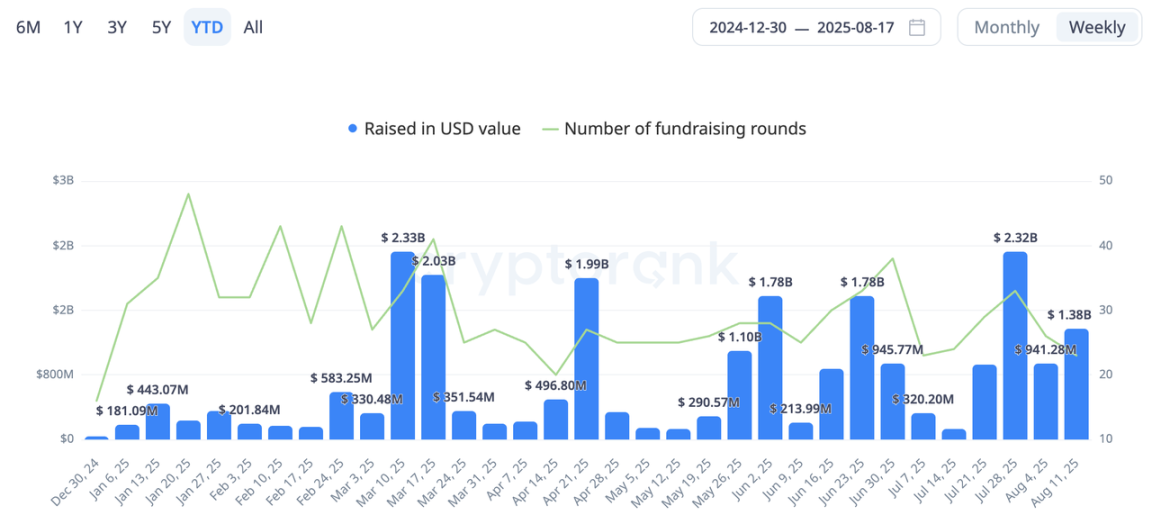 上周加密货币一级市场完成融资总额约 13.8 亿美元,处于年内高位区间。其中,数字资产交易平台 Bullish 以 54 亿美元估值、完成 11.1 亿美元的 IPO 融资,成为最大单笔融资。整体来看,上市公司 DAT(Digital Asset Treasury)战略及 AI 赛道依旧是资金关注核心,资本市场对“加密储备”与“AI+Crypto”叙事的热情仍在延续。