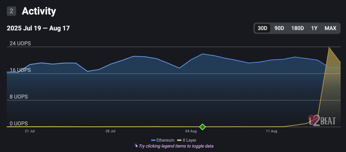 X Layer 是 OKX 与 Polygon 基于 Polygon CDK 搭建的 zkEVM Validium(非 Rollup)的 Ethereum L2。交易以 ZK 证明保证正确性,但交易数据本身不上以太坊,数据可用性由 DAC 托管,因此费用更低、吞吐更高。根据 L2Beat 数据,在 OKB 大额销毁后,X Layer TVL 在过去 7 天增长 103% 至约 8,500 万美元,其中在 8 月 16 日用户交易笔数超过 200 万笔,一度超过了 Ethereum。