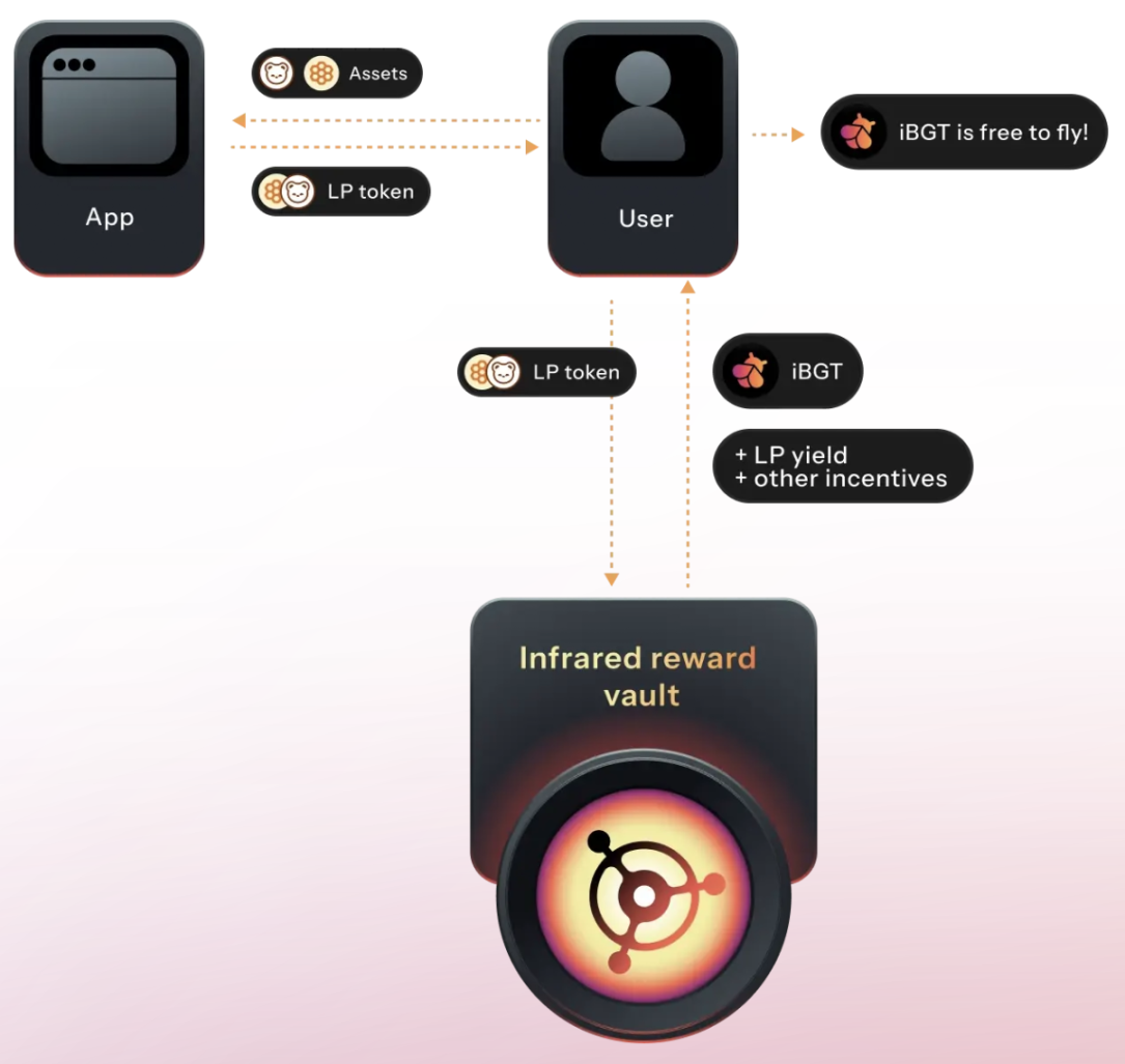 用户把 LP 代币存入 Infrared 的 Pol-vaults,由 Infrared 协议将 LP 代币存入 Bera 的原生 POL,获得 $BGT 以后,发行相应的 $iBGT,用户在 Infrared 的 Pol-vaults 领取的收益不是 $BGT,而是 $iBGT。