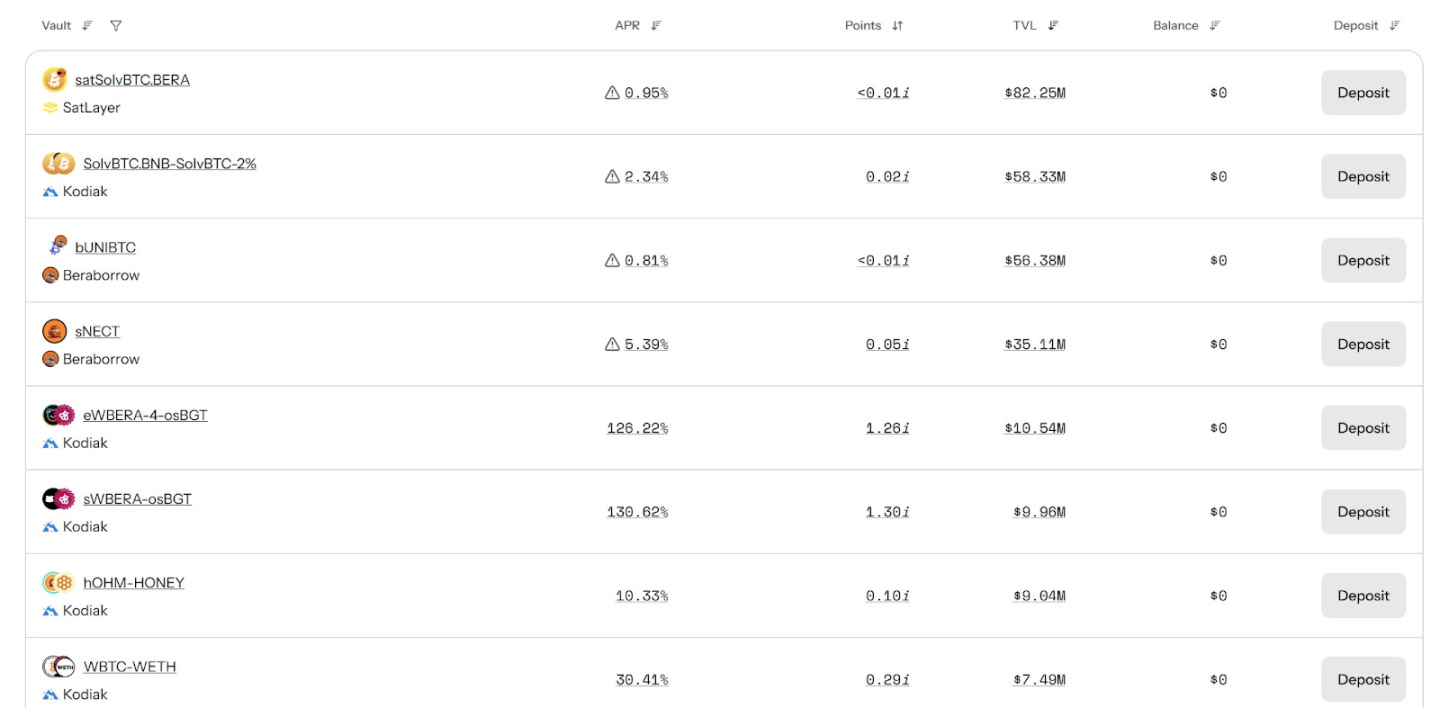 TVL 最高的是跨链到 Berachain 的 satSolvBTC,TVL 超过 8000 万美元。可见,Infrared 的 Pol-vaults 也支持非 LP 类的单币种流动性。