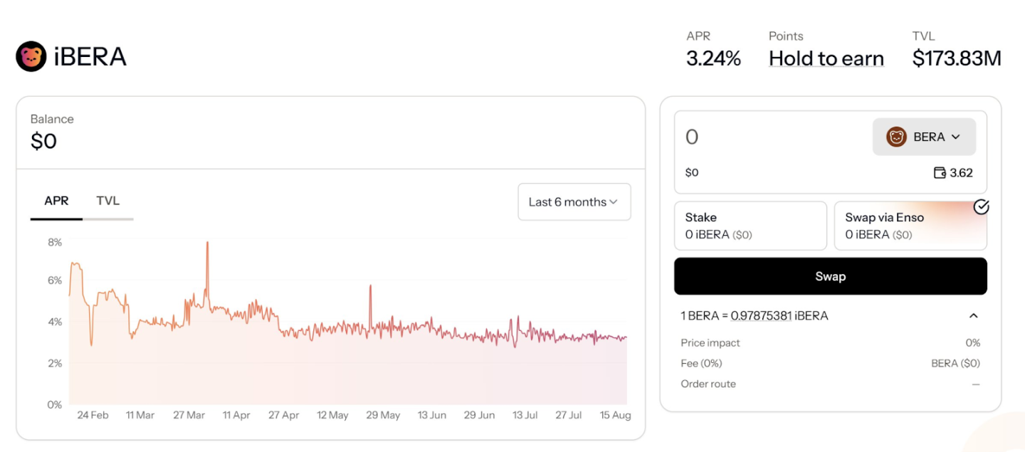 2025 年下半年,iBERA 的 TVL 趋于稳定,目前 TVL 为 1.74 亿美元,APR 为 3.24%。