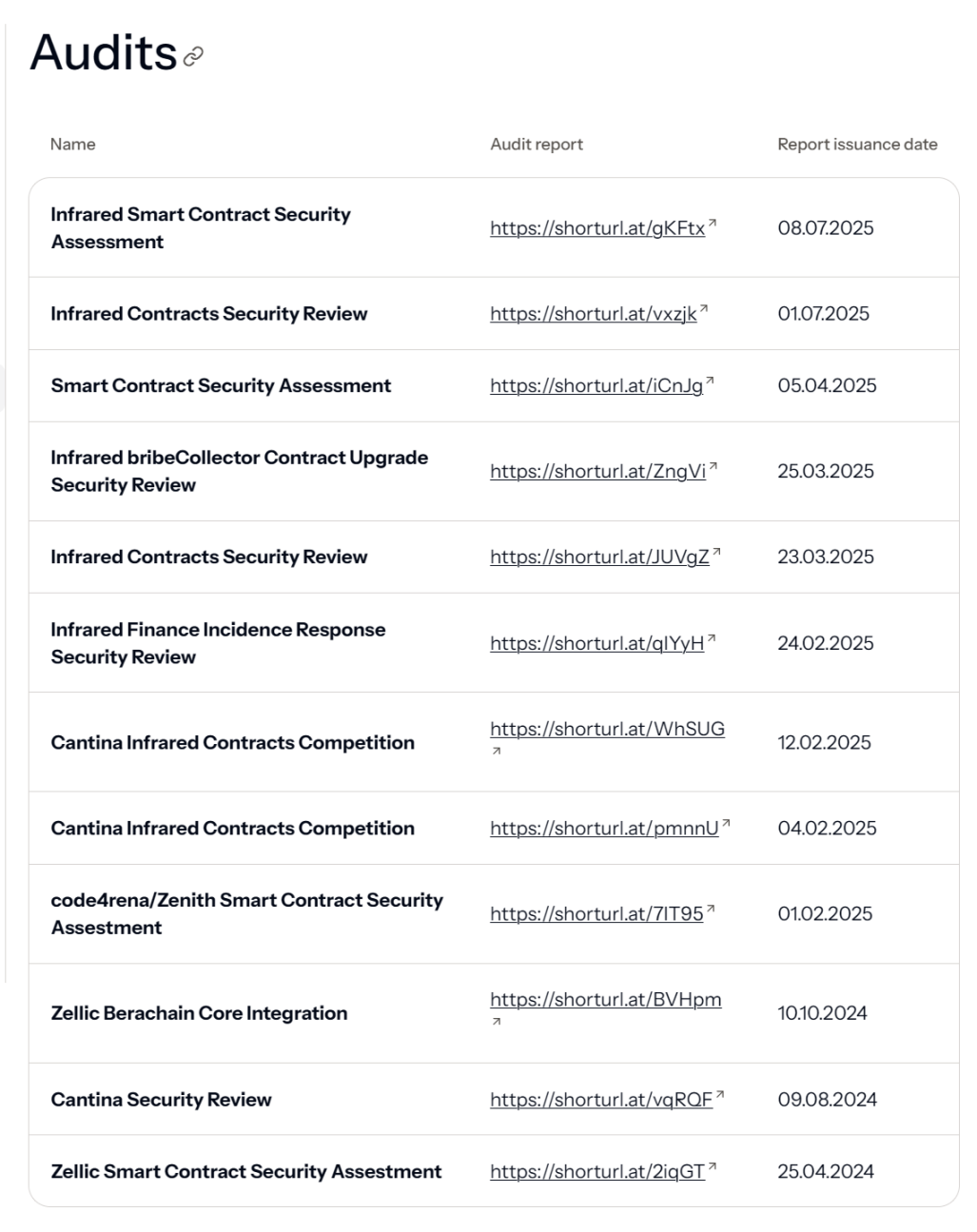 其次,2024 年 4 月至今,Zellic、Zenith、Cantina、Spearbit 共对 Infrared 进行了 12 次安全审查,包括代码审计、安全评估、安全竞赛等。