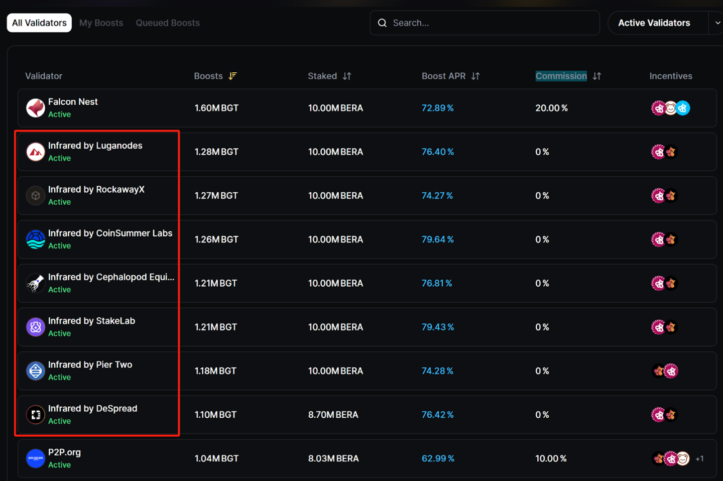 根据 Berahub,Boost 数量排名最高的验证者中,几乎大部分由 Infrared 的节点占据。