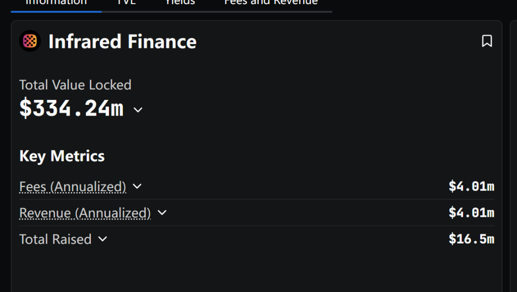 根据 Infrared 官网,平台总 TVL 达到 5.33 亿美元。Defillama 使用不同的口径统计,Infrared 的 TVL 为 3.34 亿美元,而同一口径统计 Berachain 生态总 TVL 为 3.83 亿美元。