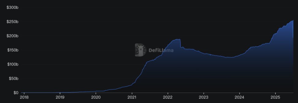 全球稳定币市值增长趋势(2019–2025):稳定币总市值从 2019 年底不足 100 亿美元攀升至 2025 年第二季度的逾 2500 亿美元规模 。这意味着自 2020 年底以来增长了 5 倍以上,反映出稳定币需求的爆发式扩张和在加密市场中的地位迅速提升。