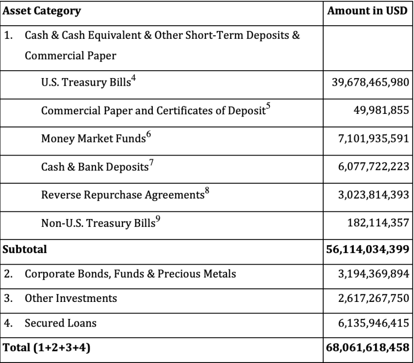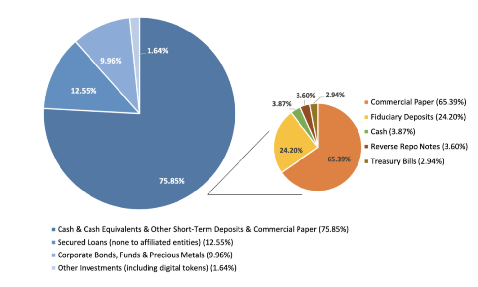 上图为各季度储备中不同资产类别占比,由深到浅分别为:现金储备、美国国债(直接或间接持有)、Tenther 代币总量,显示出自 2022 年起美债比例大幅上升 。