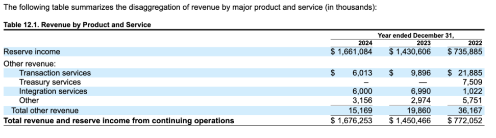 储备利息是 Circle 绝对主体收入。Circle 的收入模式极为简单:即将发行 USDC 获得的美元储备投资于安全、短期的有息资产,由此赚取利息收益 。根据 Circle 披露,其 2024 年收入中的 99% 以上来自 USDC 储备产生的利息,这一比例在 2023 年为 98.6%、2022 年为 95.3%,呈现随利率上升而更趋集中的态势 。