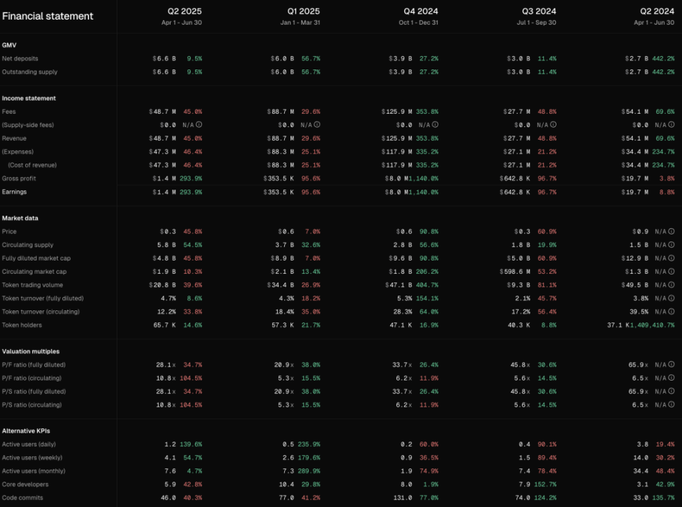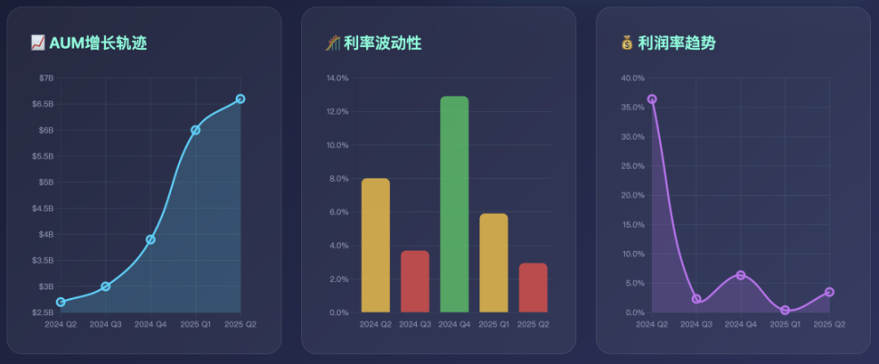 根据 Token Terminal 数据,从 2024 Q2 到 2025 Q2,USDe 的 AUM 经历了从 27 亿美元到 66 亿美元的波动,增长率 144.6%。而季度收益收入波动较大,从 4700 万美元一度增长至 1.26 亿美元,再回撤缩至 4800 万美元左右。