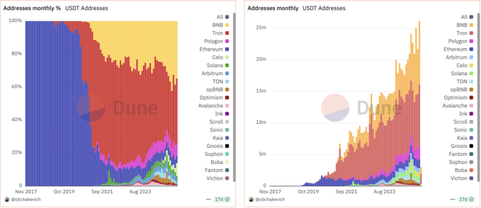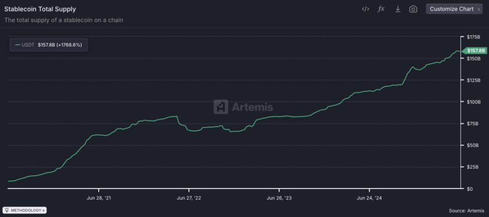 其中,USDT 仍为规模最大的稳定币,供应量在 2024 年已突破 1180 亿美元,占当时稳定币市值近 75% ;截至 2025 年中,USDT 流通量进一步增至约 1500 亿美元,约占全球稳定币总量的 63% 。