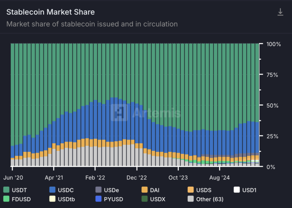 目前全球稳定币总市值已占加密市场总值约 7–8% 。在众多稳定币中,USDT 与 USDC 占据主导地位,两者合计市场份额超过 88%(USDT:63.5%,USDC:24.9%)。