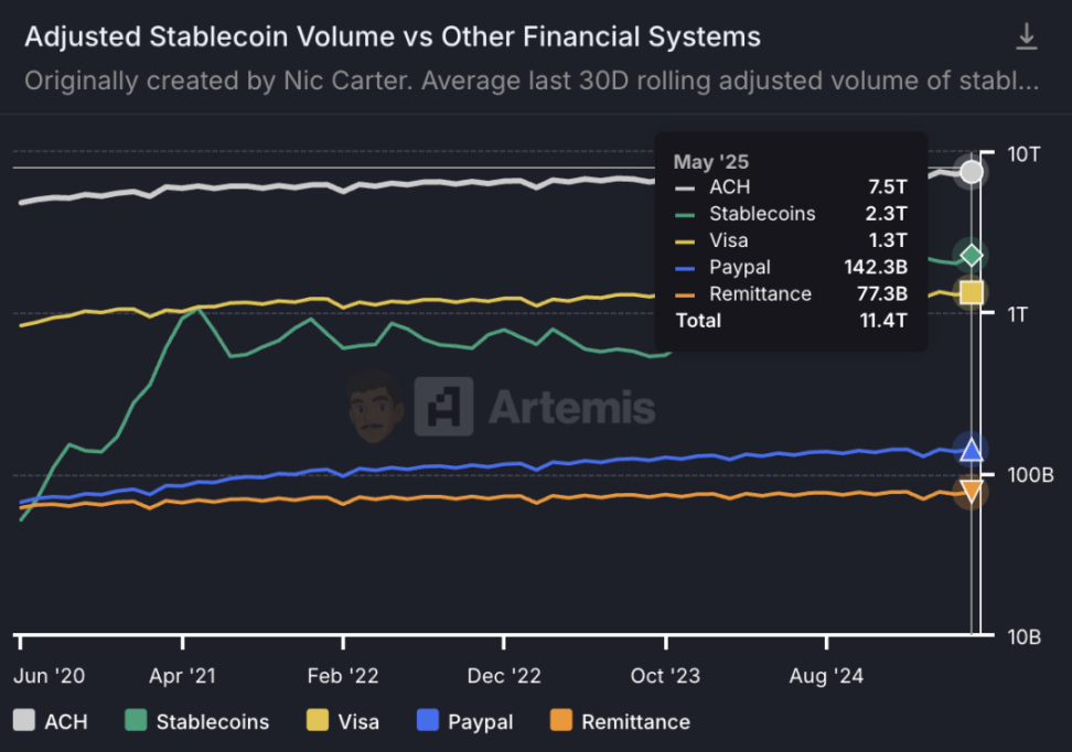 源:artemisanalytics,稳定币的结算金额超过 Visa 成为世界第二大结算架构