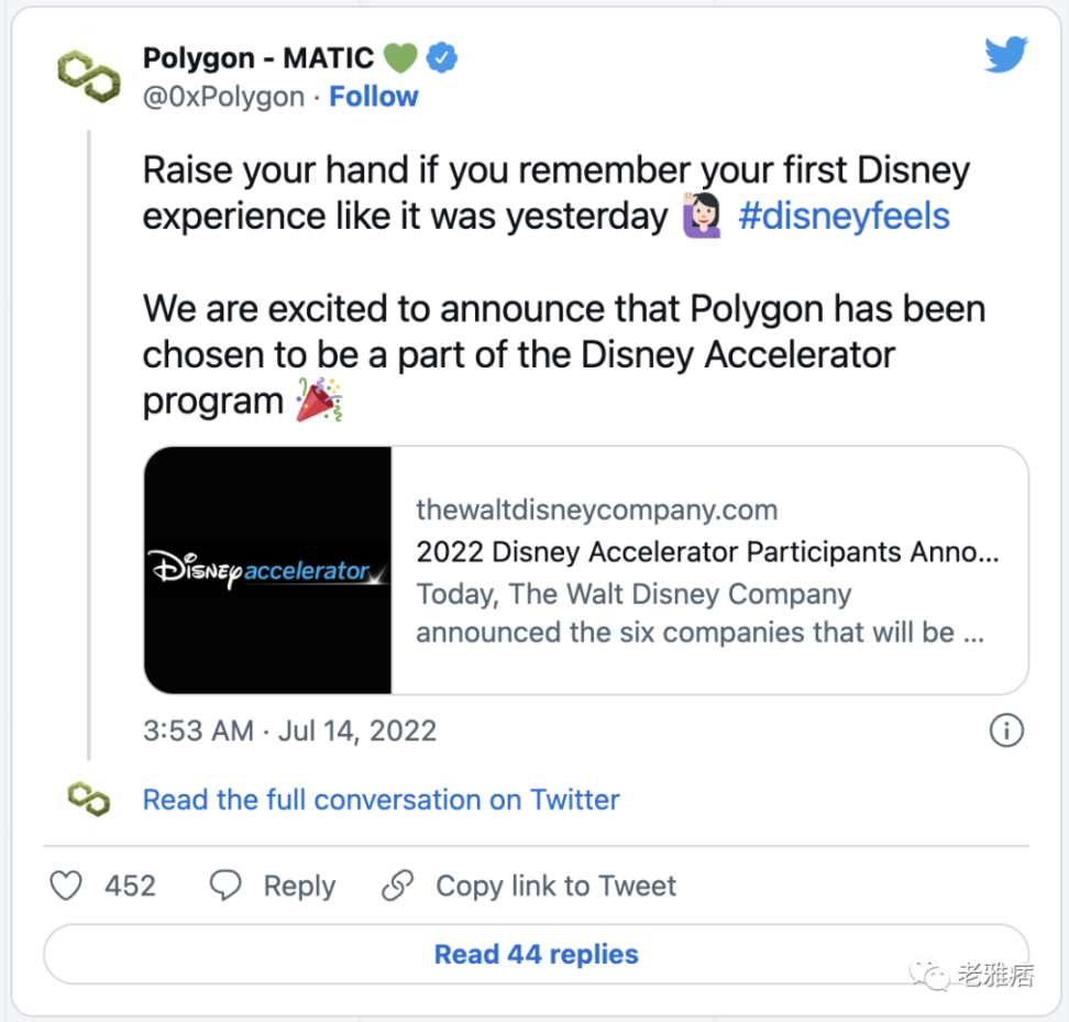 迪士尼周三宣布了其加速器计划的2022名参与者,领先的Web3公司Polygon也在其中。Polygon账户在推特上发了一条官方公告的链接:"如果你记得你的第一次迪士尼经历就像昨天一样,请举手,我们很高兴地宣布,Polygon被选为迪士尼加速器项目的一部分"。