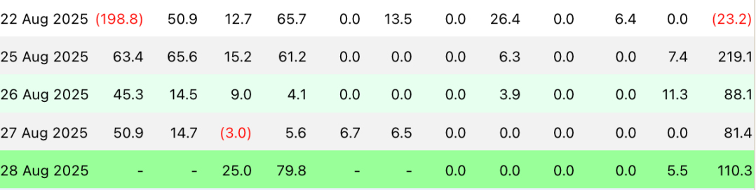 尽管近几日呈现资金回流迹象,但从月度数据来看,8 月整体比特币 ETF 或将录得约 12 亿美元的净流出,为历史第二高,仅次于今年 2 月的 35 亿美元。值得注意的是,这已是比特币 ETF 连续五个月出现资金净流出,而同期以太坊 ETF 则保持吸金趋势,显示出机构配置偏好的分化。