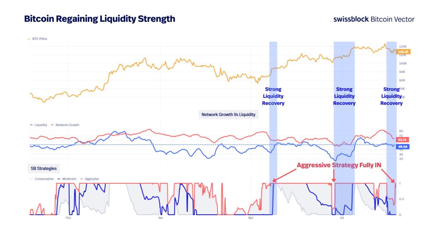 8 月 24 日,Bitcoin Vector 报告显示,比特币链上流动性出现回升。历史上,每一次流动性复苏都伴随着比特币价格的持续上涨。Swissblock 已将其策略调整为激进配置,并认为当前流动性特征与过往牛市初期高度相似。