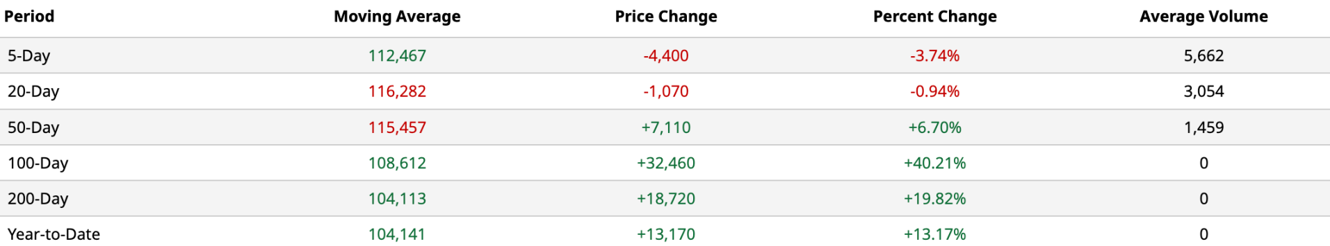 短期来看,当前价格略低于 MA5,显示出短线承压迹象,若短期无法快速回升至 MA5 之上,可能出现进一步下探。MA20 与 MA50 均高于现价,说明近期市场在中期均线附近存在较强阻力,需突破 $115,000-$116,000 区间才能打开进一步上涨空间。MA100 与 MA200 仍然位于现价下方,且两者呈现稳步上升趋势,表明长期趋势依然维持健康的上升结构。