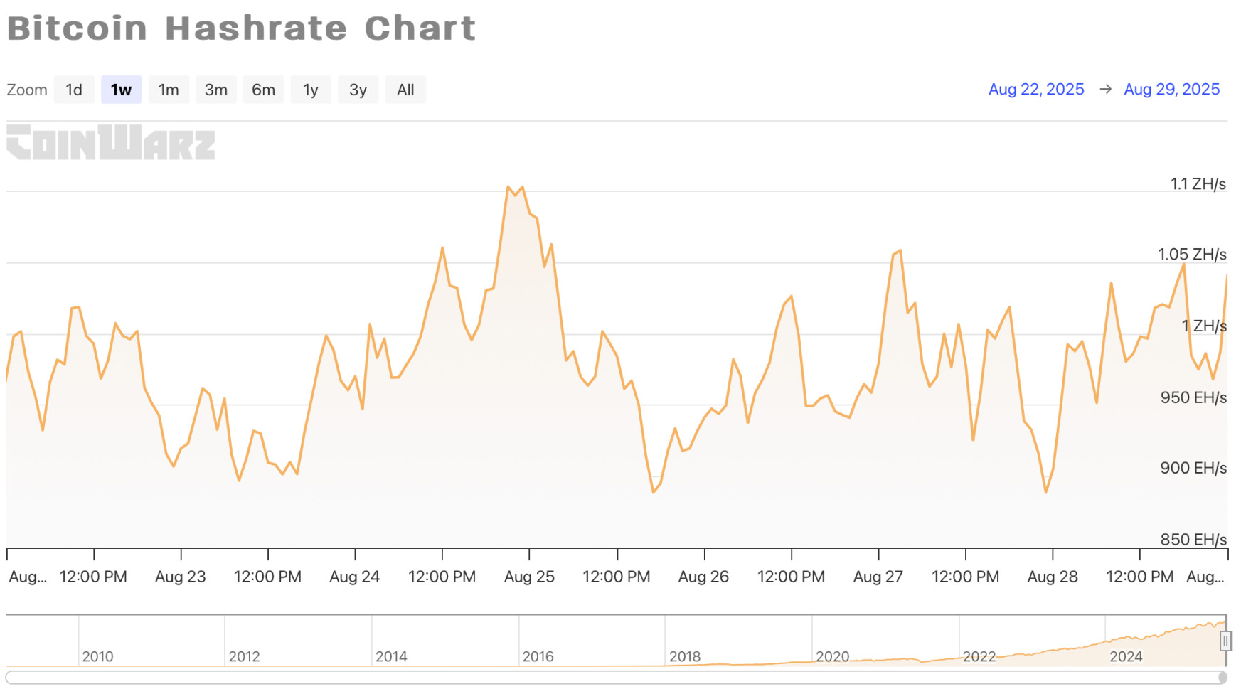 8 月 23 日至 24 日,哈希率震荡攀升,自 897.09 EH/s 稳步攀升至 1.1034 ZH/s,显示出矿工算力在短期内快速集结的态势。然而,8 月 25 日,网络哈希率出现急速回落,一度下探至 888.675 EH/s,表明部分算力在高位迅速退出,可能与比特币价格波动、矿机调配或区域性算力波动相关。