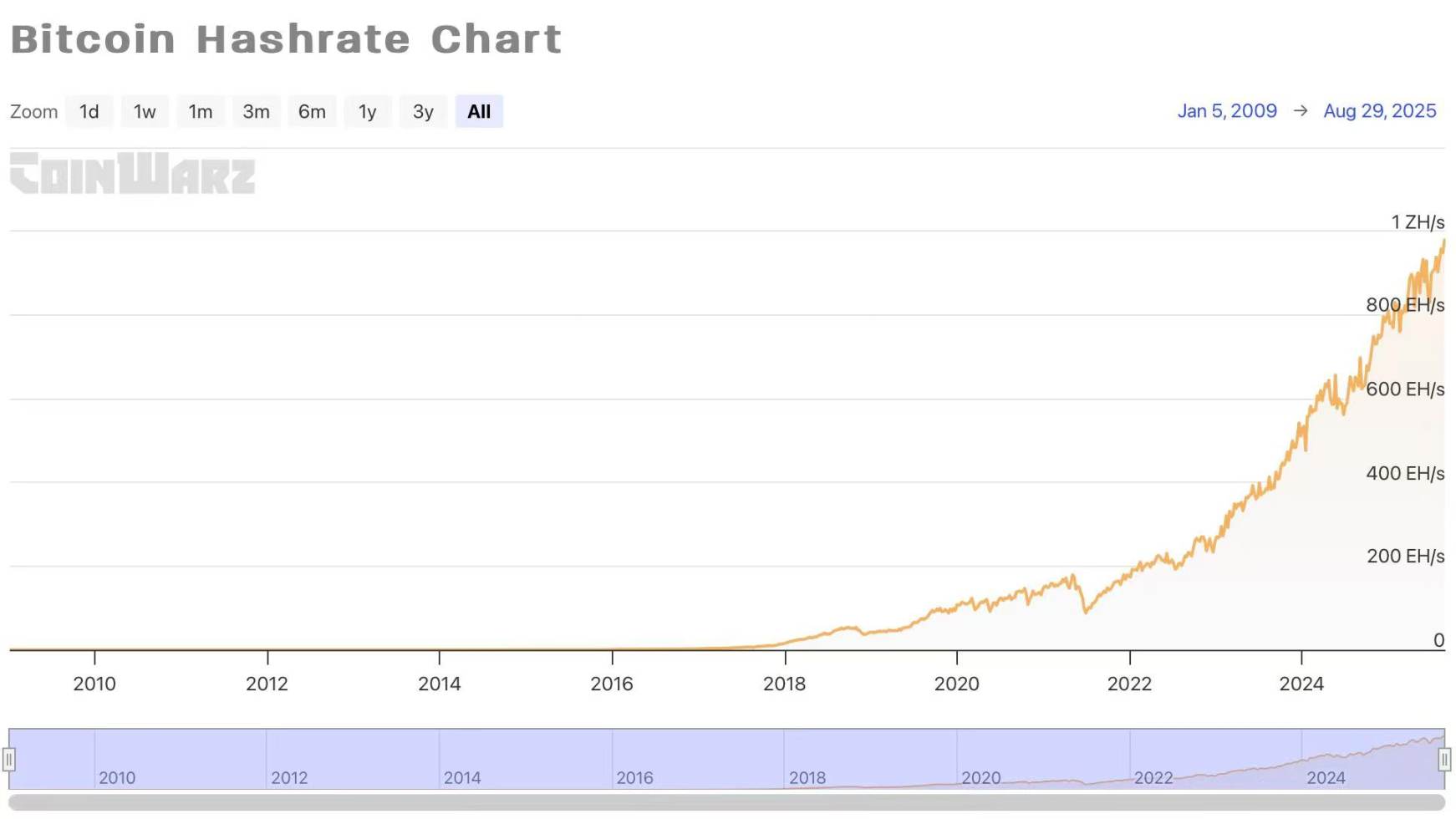 从 2018 年至 2025 年,比特币网络哈希率经历了跨越式增长:自 2018 年初的约 15.42 EH/s,持续攀升至当下的 约 1.1 ZH/s,七年间实现了近 70 倍的增长。这种增长背后,既反映出矿机硬件迭代与能效提升的持续推动,也体现出比特币生态在价格周期与产业资本投入驱动下的快速扩张。