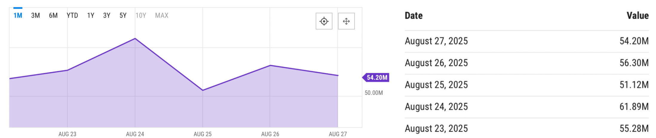 整体来看,本周比特币挖矿收入呈现“先升后降、再小幅回升”的波动趋势。这一走势主要受 比特币现货价格波动、网络算力变化及交易手续费水平的共同驱动。其中,8 月 24 日收入触及本周高点 6,189 万美元,随后在 8 月 25 日大幅回落至 5,112 万美元,显示市场短期内出现价格与手续费的同步收缩。进入周末尾声,挖矿收入有所修复,反映出矿工收益在短期调整后的 一定韧性。