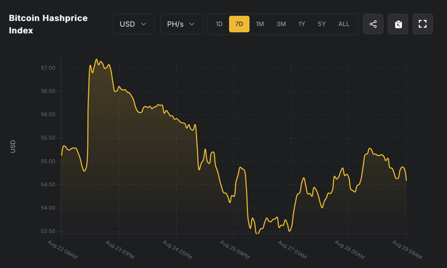 从单位算力每日收益(Hashprice)的角度观察,Hashrate Index 数据显示,截至 2025 年 8 月 29 日,Hashprice 为 54.45 美元 /PH/s/ 天。本周 Hashprice 与比特币价格走势基本一致,表现为高位回落后逐步修复: