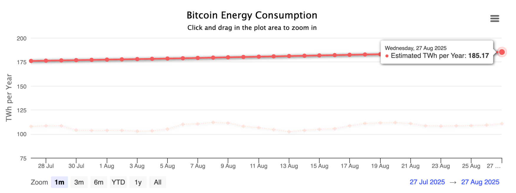 根据 Digiconomist 数据,2025 年 8 月以来,比特币能源消耗指数持续走高:从 7 月 27 日的 175.91 TWh/ 年 上升至 8 月 27 日的 185.17 TWh/ 年。这表明,算力增长带来的挖矿难度提升,正推动比特币全网的能源需求不断增加。尽管部分矿场通过采用高效制冷、使用水电、风能、太阳能等可再生能源来降低成本和碳排放,但整体趋势依旧是算力与耗能正相关。能源消耗的持续走高,也对矿工的运营成本提出了更高的要求,电力成本成为决定盈利能力的关键变量。