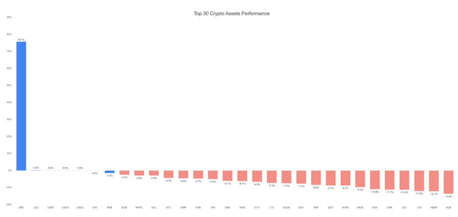 Last week has been bloody for most of the top30 tokens, as significant price readjustment has been spanned across those multiple assets, as an afterwave of investors’ profit taking actions. The only asset that showed exceptionally strong gain is CRO, which benefits from the announcement that Trump Media, Crypto.com and the blank check firm Yorkville Acquisition will soon go into a de-SPAC deal for a CRO strategy DAT firm.