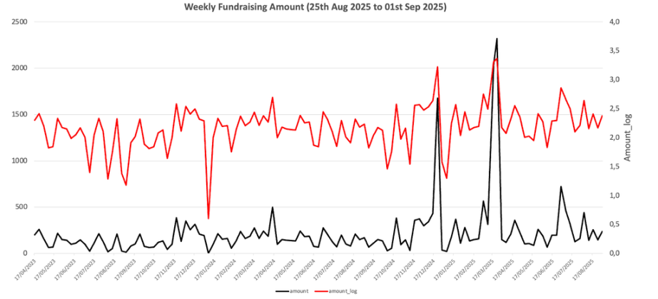 Total weekly fundraising rose to $237M for the 5th week of Aug-2025, an increase of +60% compared to the week prior. Weekly fundraising in the previous week was up 28% year over year for the same period.