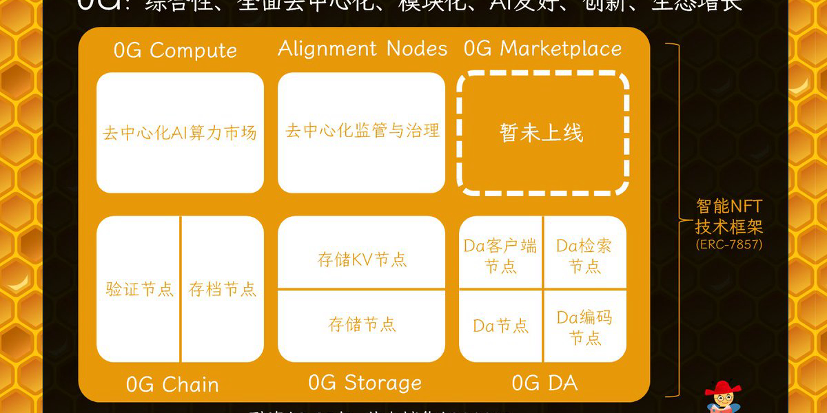 基于技术基础设施,0G 构建了更宏观的 AI 生态体系。0G 生态基础设施包括 0G Compute、0G Marketplace 和 Alignment Nodes 模块。
