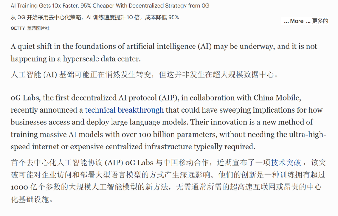 根据福布斯数字资产频道的报道,0G 与中国移动合作,宣布了一种高速度、低成本的 AI 训练框架——DiLoCoX。