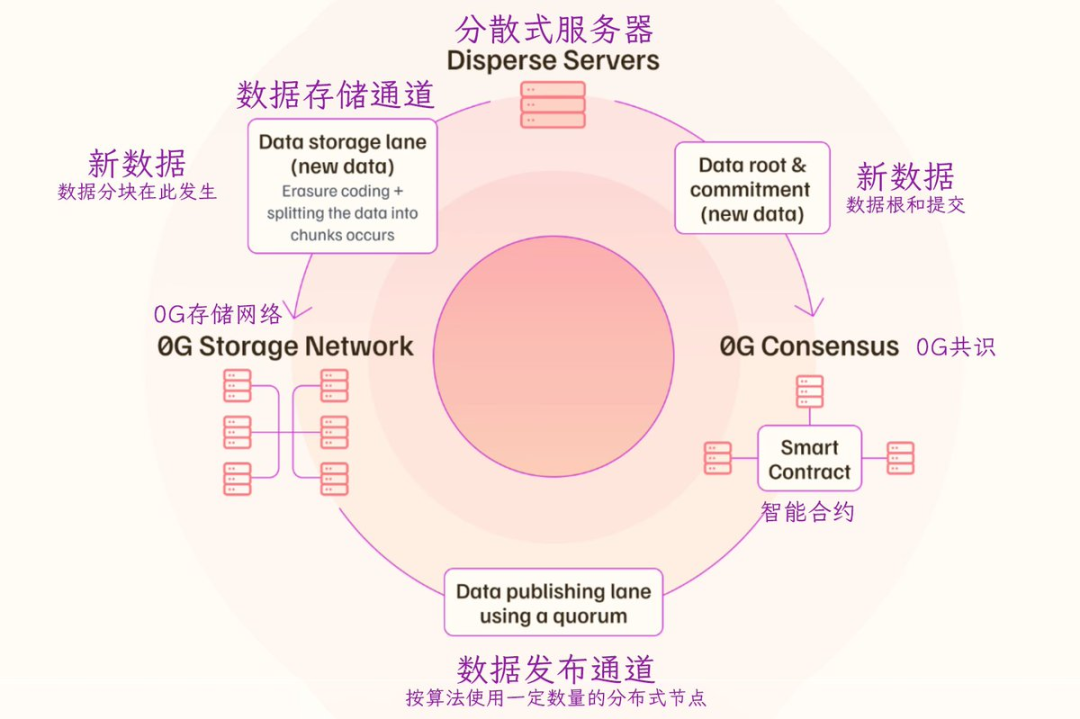 数据发布通道在收到新的数据以后,负责生成相应的元数据,生成和验证存储的可用性证明,通过 0G 的网络公识并将有关信息写入区块链智能合约 ( 可能是 0G Chain 也可能是其他区块链,0G 网络采用模块化结构,0G Chain 和 0G Storage 可以独立衔接外部生态使用 )。