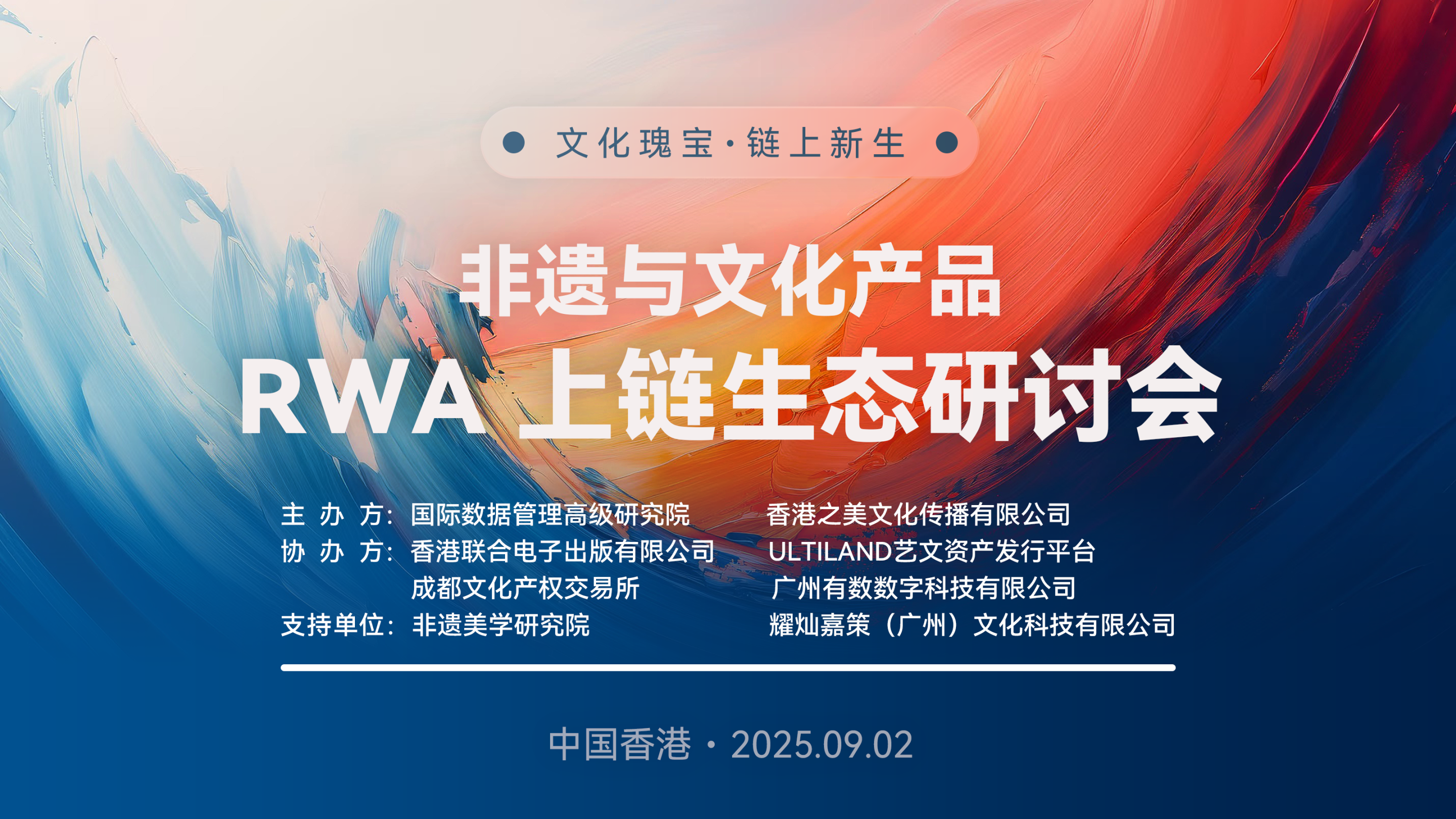 2025 年 9 月 2 日,主题为 “非遗与文化产品 RWA 上链生态” 的研讨会在香港湾仔万通保险中心圆满落幕。活动由国际数据管理高级研究院、香港之美文化传播有限公司、香港中小上市公司协会主办,联合电子出版有限公司、ULTILAND 艺文资产发行平台、成都文化产权交易所、广州有数数字科技有限公司协办,非遗美学研究院、耀灿嘉策(广州)文化科技有限公司提供支持。活动吸引了艺术、金融、拍卖、科技等多个领域的专家与机构代表,共同探讨跨境数字文化资产的未来。