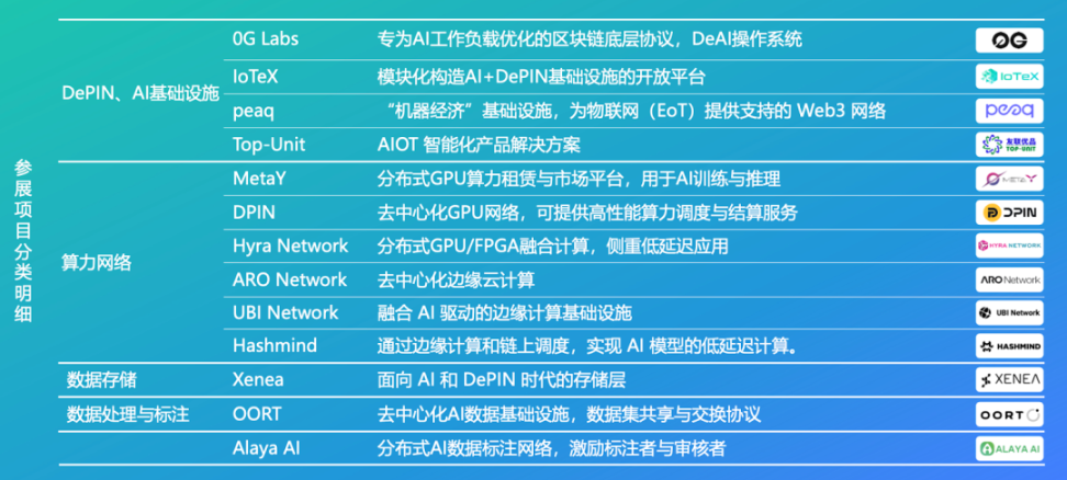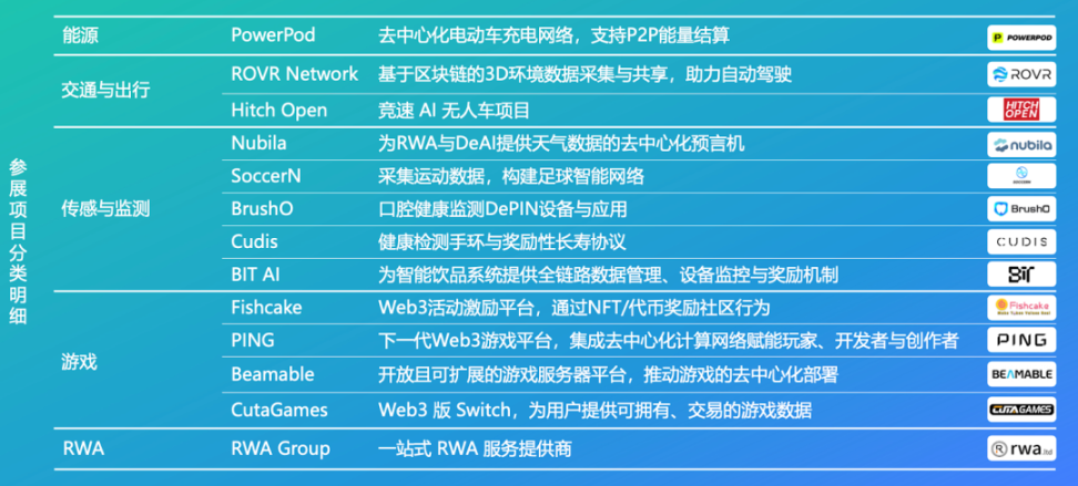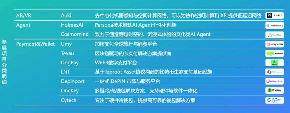 大会设有 Open Stage 环节,超过 20 个 DePIN 项目进行了现场展示,涵盖去中心化存储、边缘计算、智能硬件、数据采集、支付解决方案等多个领域。参展项目分类情况如下图所示。